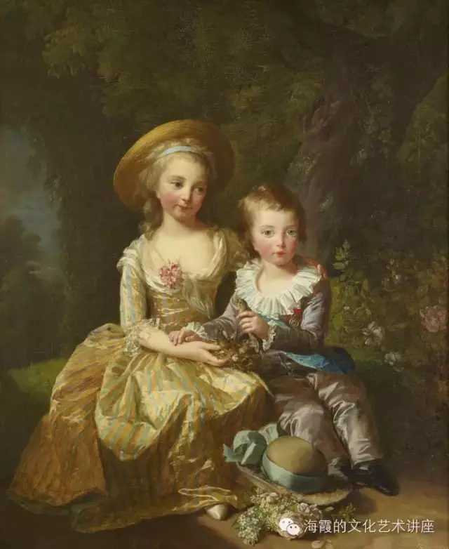 勒布朗也给王室的孩子画像。受卢梭《爱弥儿》一书的影响,她没把王储公主画成僵硬的小玩偶,而是把他们放置在充满田园气息的大自然背景里,完全体现了启蒙思想倡导的顺应儿童自然天性、培养合格公民的教育新理念。