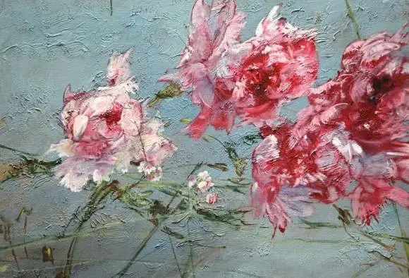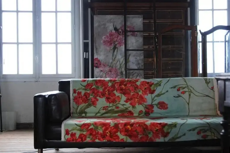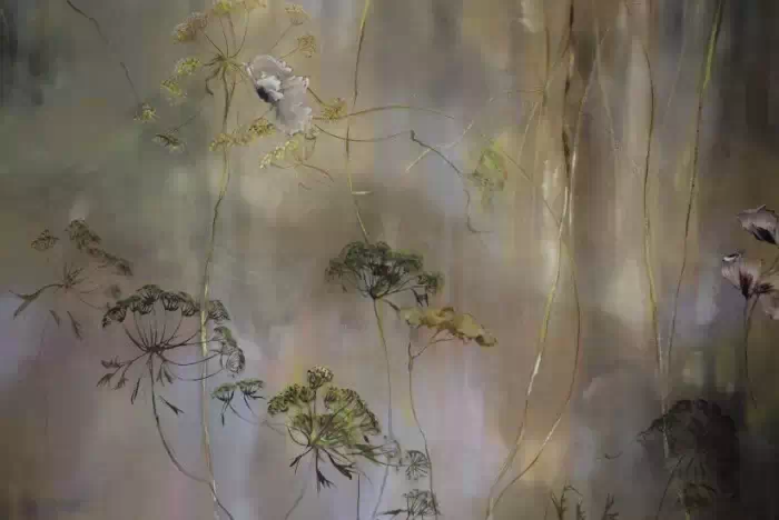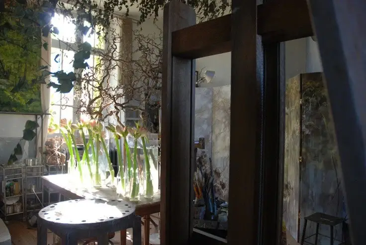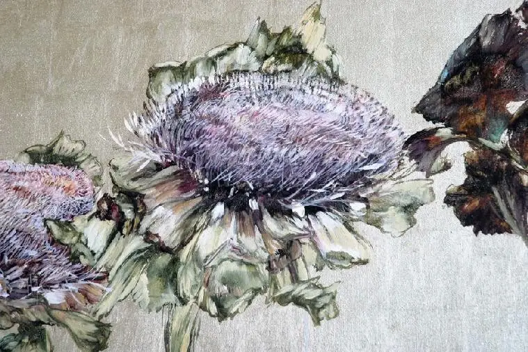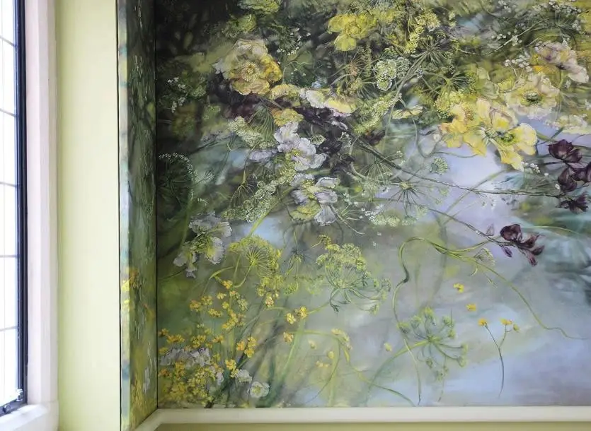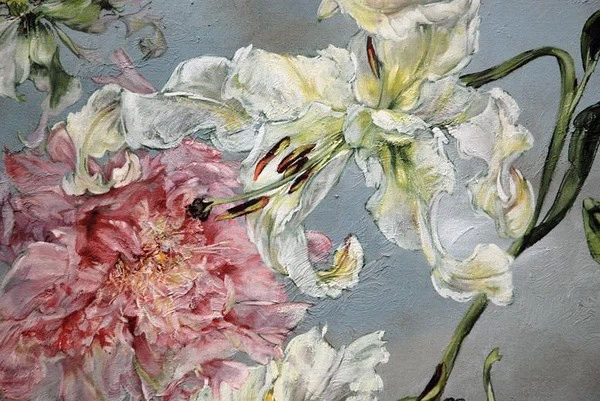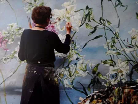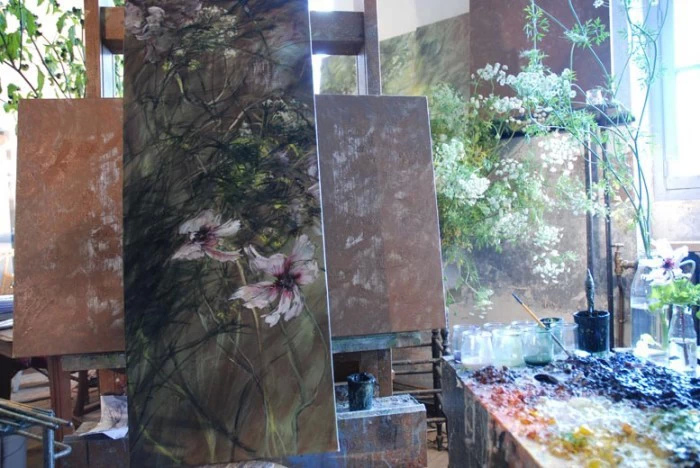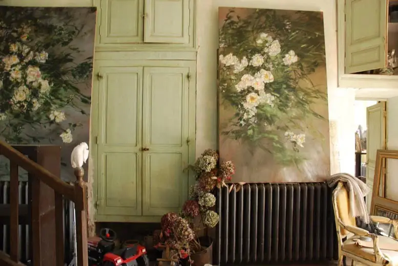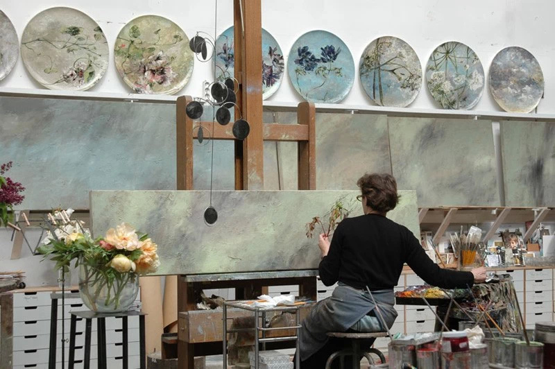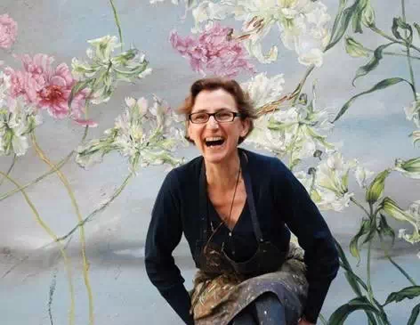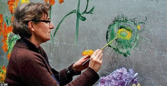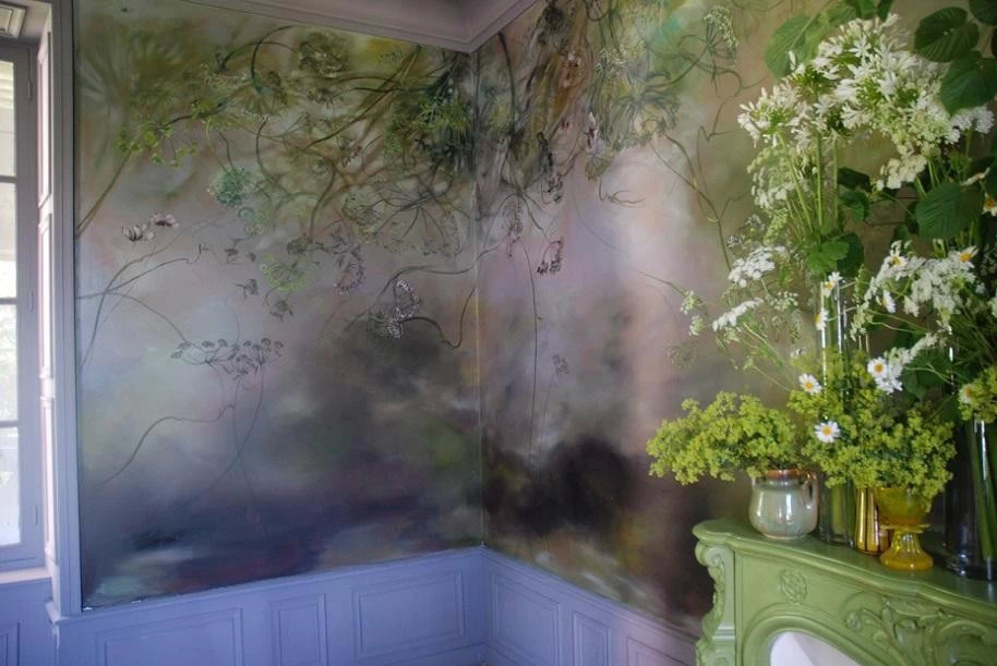 法国女画家克莱尔.巴斯勒,据说特别爱花草植物,不仅将它们画在油画布上,还画在家里的墻壁上,用具上,可谓以花为邻。真是“若有丹青色,愿做花仙人。我为花添彩,花因我生情”。