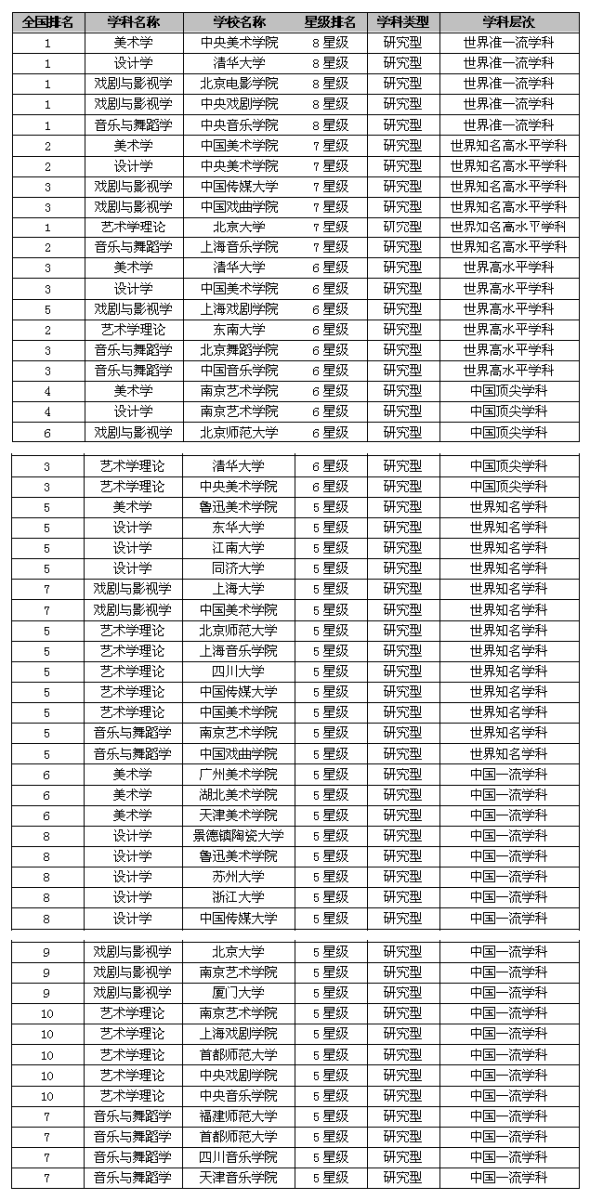 统计发现,全国高校艺术学门类有5个学科荣膺2016中国八星级学科,跻身世界一流学科、世界准一流学科队列,是全国高校“双一流”战略建设中国特色、世界一流学科的高峰学科;6个学科荣膺中国七星级学科,跻身世界知名高水平学科队列11个学科荣膺中国六星级学科,跻身世界高水平学科、中国顶尖学科队列;33个学科荣膺中国五星级学科,跻身世界知名学科、中国一流学科队列;93个学科荣膺中国四星级学科,跻身中国高水平学科队列;299个学科荣膺中国三星级学科,跻身中国知名学科、中国区域一流学科队列。