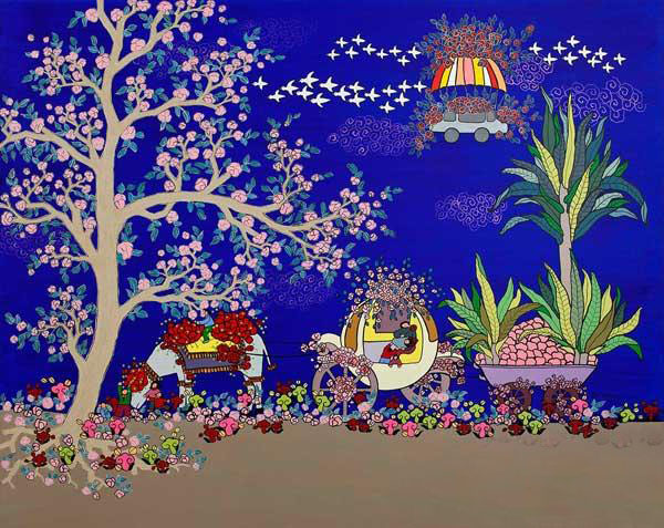 可见,画布直接作为画面图像的构成和艺术表达的一个因素和要素确实罕见之极。然而,吴争艳的作品是罕见之中的确实存在。画面以红、黄、蓝、绿的大花为画面大部分的图像和色彩构成,视觉上激烈又刺激,有一种极强的心理感染力。在这艳丽的花丛中,或点缀或半隐半露的物体和人物形象穿插其中,而这花并非作者的构思,而是现成的稼用,这是一种花布,是中国北方传统的被子面花布,是以前人们用来做被子用的。虽用这种布作为艺术创作的成份和手段者早有人使用过,或在画面中描绘、或用之拼贴、或在装置作品中使用,但这些并未尽其用,花布皆为衬托者。然,吴争艳直接将其作为画布,且以布上的花作为自己作品图像内容和内涵的一个重要的组成部分,可谓之极致和彻底!